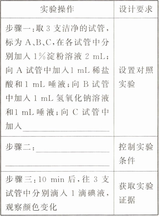 |步骤一:取3支洁净的试管,标为A、B、C,在各试管中分别加入1%淀粉溶液2mL;向A试管中加入1mL稀盐酸和1mL唾液;向B试管中加入1mL氢氧化钠溶液和1mL唾液;向C试管中加入________|设置对照实验|