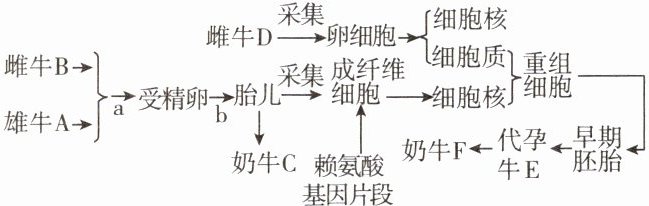 9. 下面是吉林大学农学院奶牛繁育基地成功培育携带外源赖氨酸基因的克隆奶牛的过程示意图,请据图回答下列问题。
