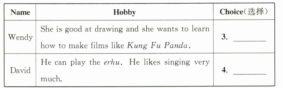 这是一道英语阅读理解填空题,考查学生对文本信息的提取和匹配能力。解题的关键在于仔细阅读每个人的爱好描述,然后将其与对应的俱乐部进行匹配。