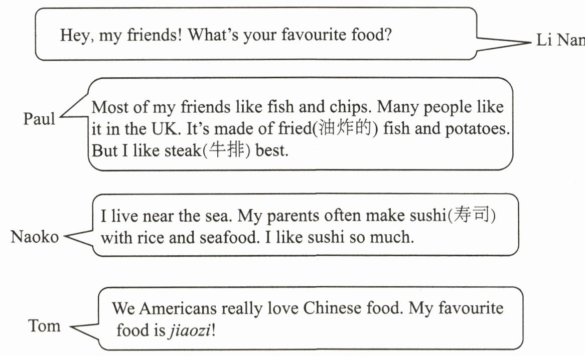 1. 根据Paul的话“Most of my friends like fish and chips.”可知,此句正确。