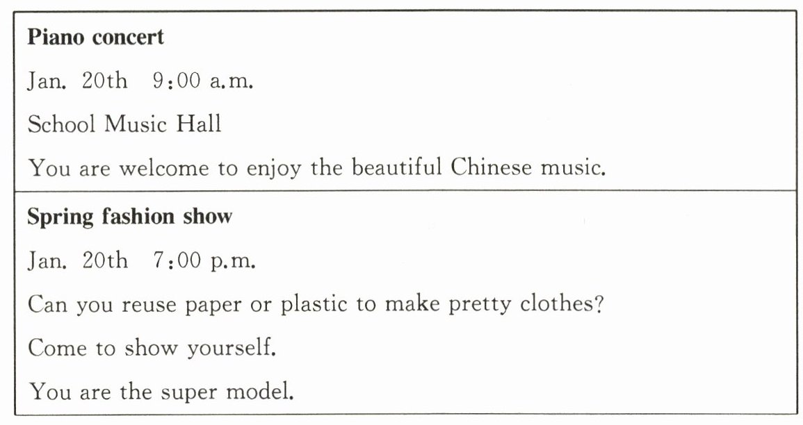 )1. You can watch a piano concert at 9:30 a.m. on January 20th at the school square.(