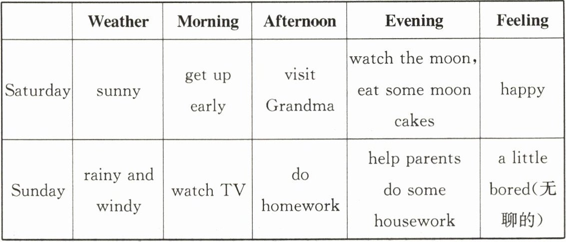 On Saturday, the weather was sunny. I got up early in the morning. In the afternoon, I visited Grandma. In the evening, I watched the moon and ate some moon cakes. I felt happy that day. On Sunday, it was rainy and windy. I watched TV in the morning. In the afternoon, I did homework. In the evening, I helped parents do some housework. I felt a little bored on Sunday.