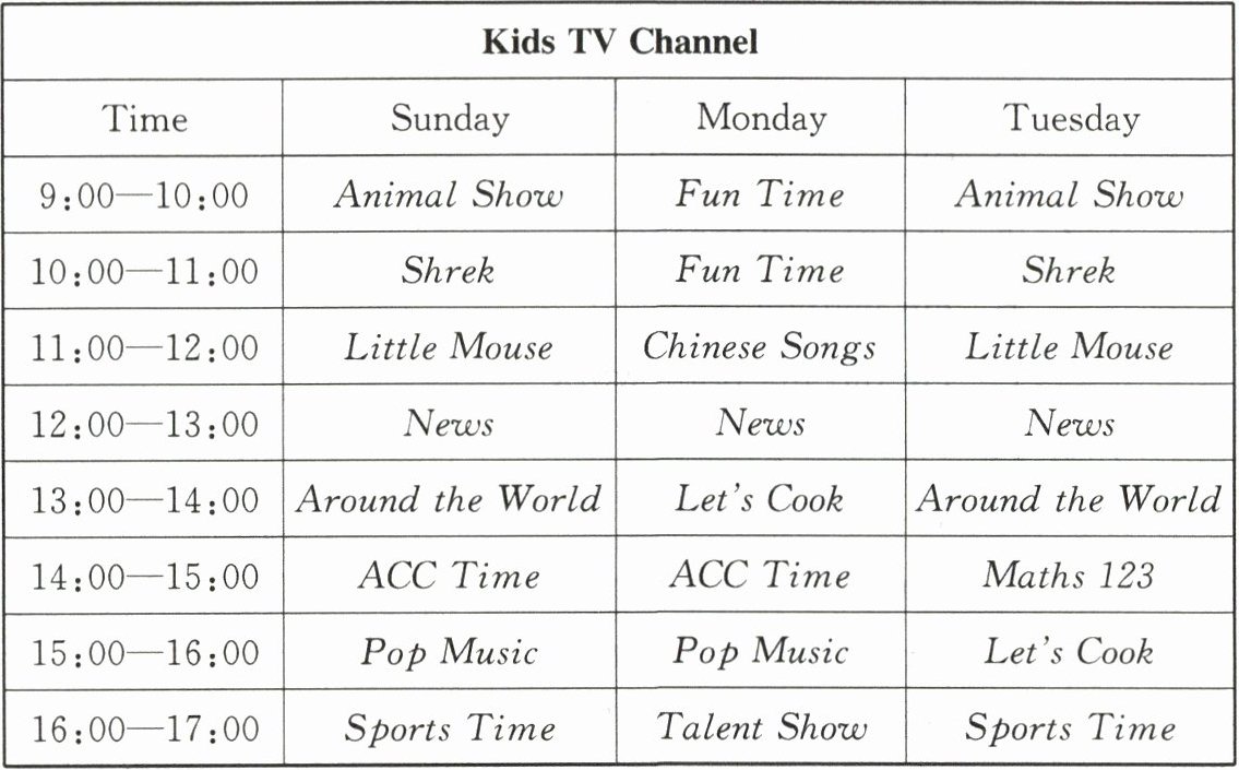 ) 4. We can watch "______" only on Tuesday.A. Maths 123 B. Animal Show C. Little Mouse