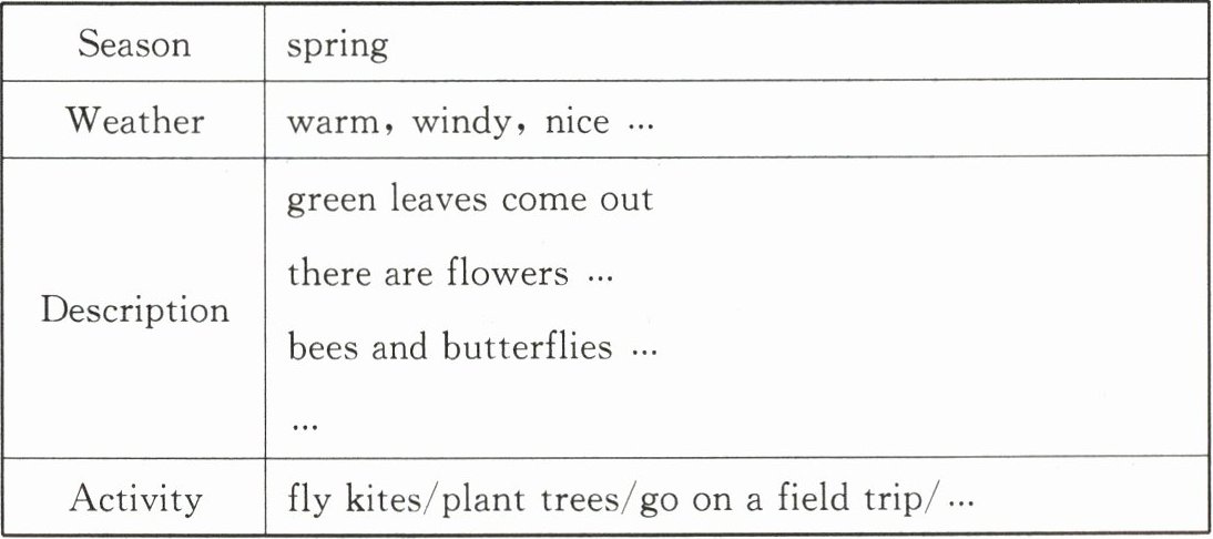根据表格提供的信息,以“My favourite season”为题,写一篇短文介绍春季,可以适当发挥,90词左右。