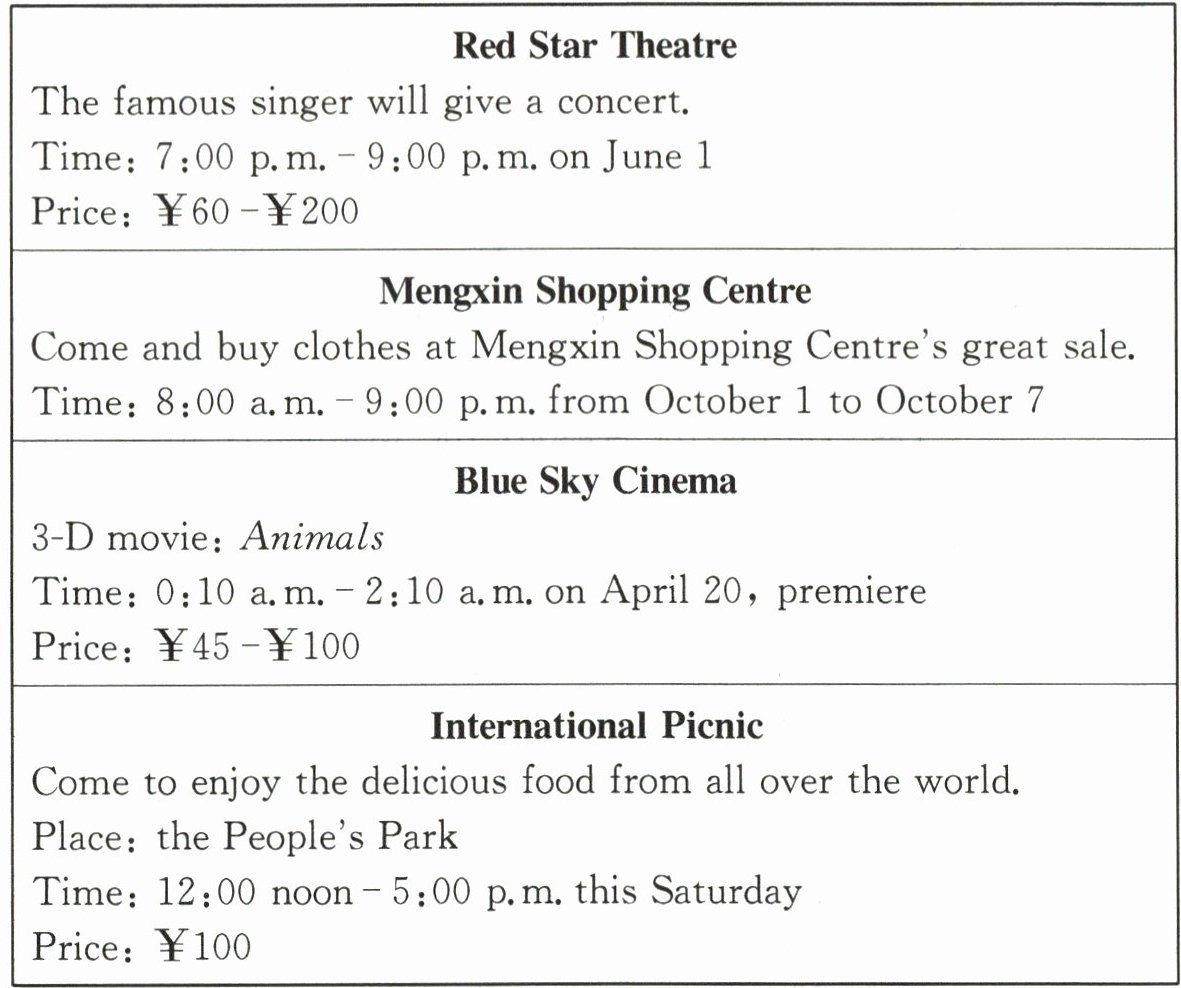 这是一道阅读理解题,主要考查学生从文本中提取信息、理解并应用信息的能力。题目给出了四个不同的场景(红星剧院、梦欣购物中心、蓝天电影院和国际野餐),每个场景都有详细的时间、地点、活动内容和价格等信息。学生需要仔细阅读题目和选项,从文本中找到与问题相关的信息,然后进行分析和比较,最后得出正确答案。