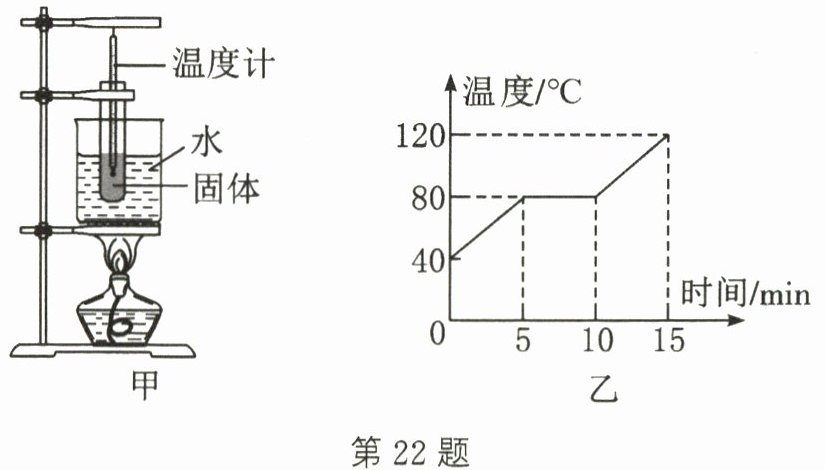 22. 如图甲所示是“探究某种固体物质熔化特点”的实验装置,如图乙所示是根据实验数据描绘出的该物质在熔化过程中温度随加热时间变化的图像。