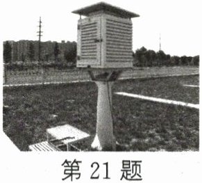 21. 将如图所示的百叶箱涂成白色是为了更好地______(吸收/反射)太阳光。百叶箱里面有三支温度计甲、乙、丙,其中甲、乙两支温度计是一个组合,甲温度计的玻璃泡上有蘸有水的棉花,乙直接放在空气中,所以我们观察时会发现两支温度计中______(甲/乙)的示数低。甲、乙两支温度计的示数差越大,说明当时的空气湿度越______(大/小)。丙温度计是可以记录一天中最高气温的温度计,所以你认为丙温度计和______(体温计/实验室温度计)的结构相似。