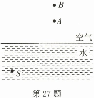 27. 在平静的湖边上有一盏路灯,人在水下S处看到了路灯的像。图中A、B两点中,其中一点是路灯的发光点,另一点是路灯的像点。请你区分发光点、像点,并在图中画出水下S处的人看到路灯的光路图。