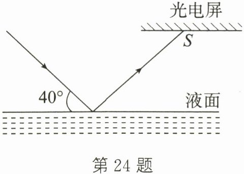 24. 有一光电控制液面高度的仪器,它是通过光束在液面上的反射光线反射到光电屏上的光斑位置来判断液面高低的。如图所示的光路中,一光束与液面的夹角为 40°,则反射角的大小为