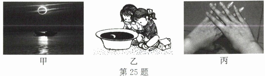 25. 如图甲所示为某日日环食在某境内完美展示的“金环入海”奇观。观测日食不能用肉眼直接对着太阳,如果没有专用的太阳滤镜,可采用如下的简便方法:一是准备一盆黑墨水置于阳光下,在脸盆中观察太阳的像,如图乙所示,这是利用了