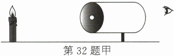 32. (8 分)如图所示,某兴趣小组在空易拉罐的底部中央戳个小圆孔,将顶部剪去后,蒙上一层塑料薄膜,制作成一个简易针孔照相机。如图甲所示,将其水平放置,在左侧固定一支点燃的蜡烛,可在塑料薄膜上看到烛焰倒立的像。