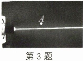 3. 小明在学习“光的传播”时,看到老师的一个演示实验,过程如下:(1) 用激光笔射向水中观察到光的传播路径是一条直线(如图);(2) 在点A处用漏斗向水中慢慢注入海波溶液,观察到光的传播路径发生了弯曲;(3) 经搅拌静止后,观察到光的传播路径又变直了。