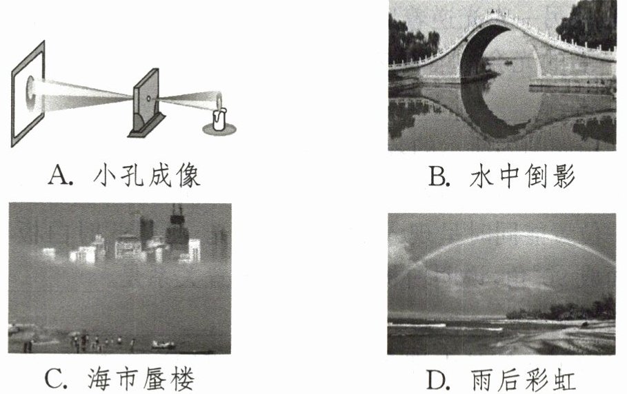 选项D:雨过天晴时,常在天空出现彩虹,这是太阳光通过悬浮在空气中细小的水珠折射而成的,白光经水珠折射以后,分成各种彩色光,这种现象叫做光的色散现象,所以说雨后的天空出现彩虹是由光的色散形成的,故D与题意不符。