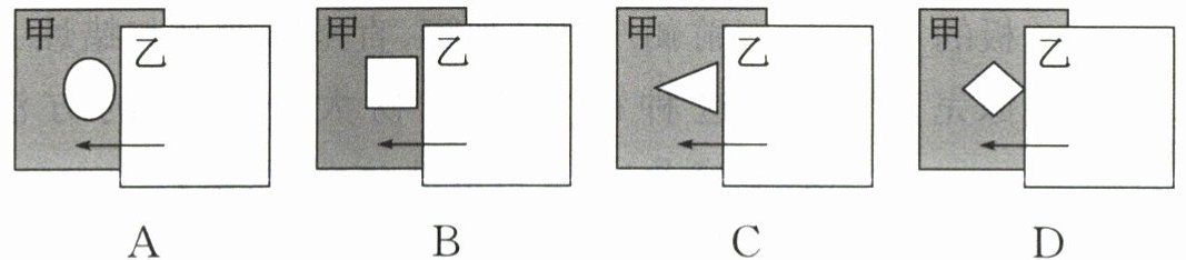 5. 在探究树荫下光斑的综合实践活动中,为了研究孔的大小对光斑形状的影响,小华设计了四种开有不同形状孔的卡片甲,并用另一张卡片乙覆盖在甲上,如图所示。接着,从图示位置沿箭头方向水平移动乙,观察光斑形状的变化情况。下列合乎要求的是 (