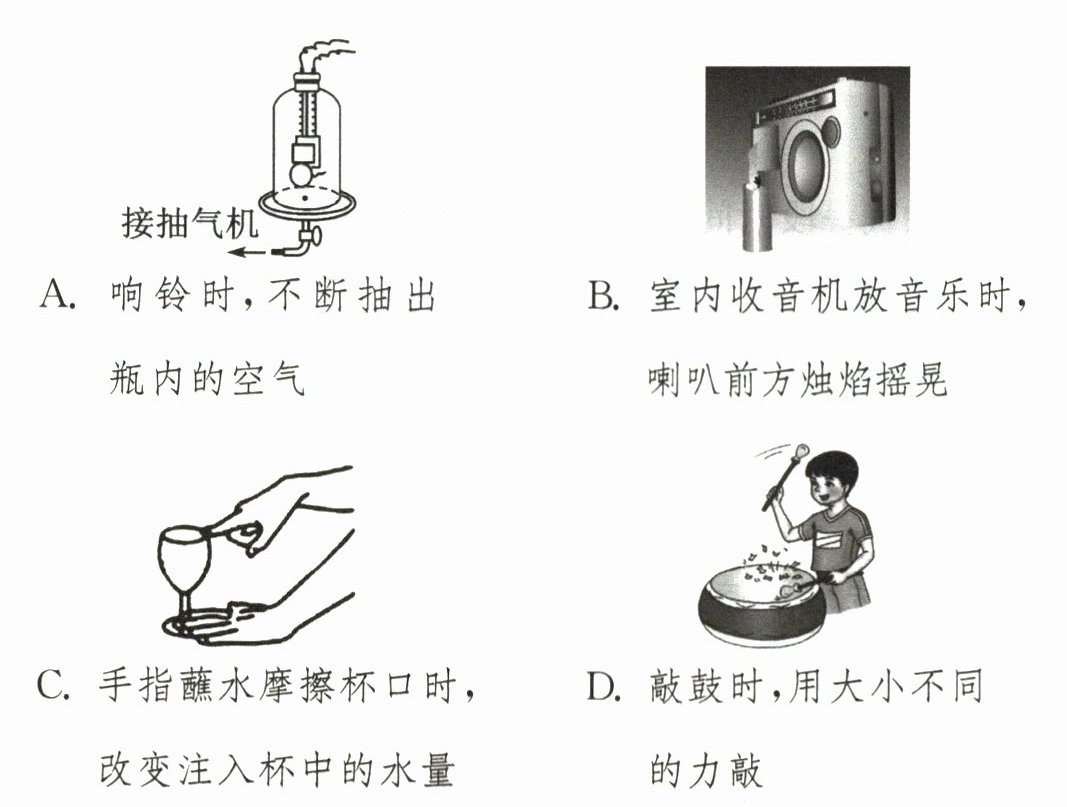 A图中响铃时,不断抽出瓶内的空气,是探究声音传播的条件--需要介质的实验,故A不符合题意;