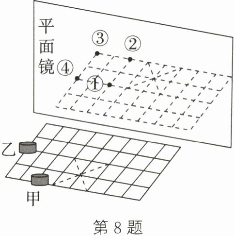 8. 如图所示,在中国象棋棋盘正中央竖立一块垂直于棋盘的平面镜,棋子“象”由甲移到乙,则平面镜中“象”的移动是(