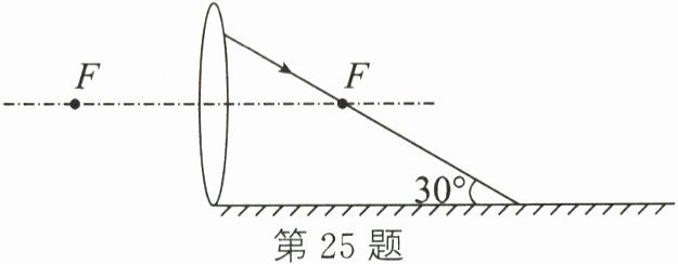 25. 如图所示,一束光射向凸透镜经折射后射到一个平面镜上。请在图中画出射向凸透镜的这束入射光和经平面镜反射的光路,并标出反射角的度数。