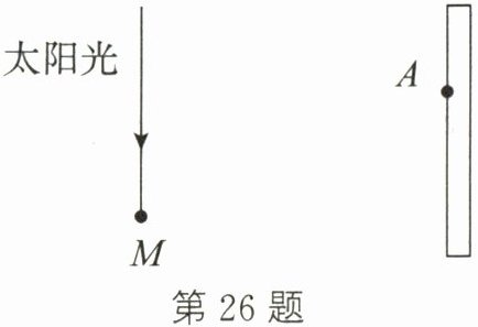 26. 小明制作了一个正午时间提醒器,他在窗台上的点M处放置一面镜子,正午时刻,太阳光便可以通过镜子照亮屋内墙上的点A。请你在如图所示的简化图中的点M处画出平面镜的位置。