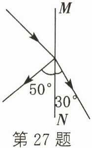 27. 如图所示,光线从一种介质射入另一种介质,其中一种介质是空气,MN 是两种介质的分界面。则入射角为