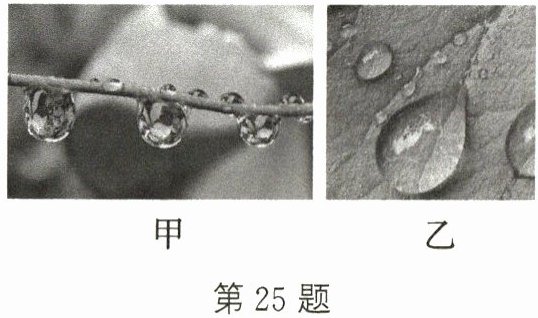 25. 清晨,我们常常会看到树枝和树叶上有一些水珠,如图所示。图甲中看到水珠后面远处的景物是倒立的;图乙中透过树叶上的水珠观察到树叶清晰的叶脉,此时水珠相当于一个