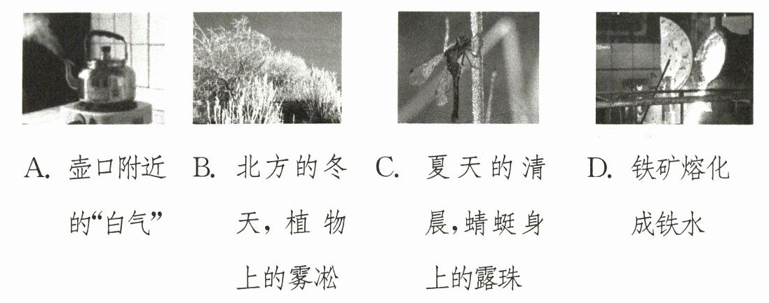 选项C,夏天的清晨,蜻蜓身上的露珠是空气中的水蒸气遇冷液化形成的小水滴,液化过程会放出热量,所以C选项不符合题意。