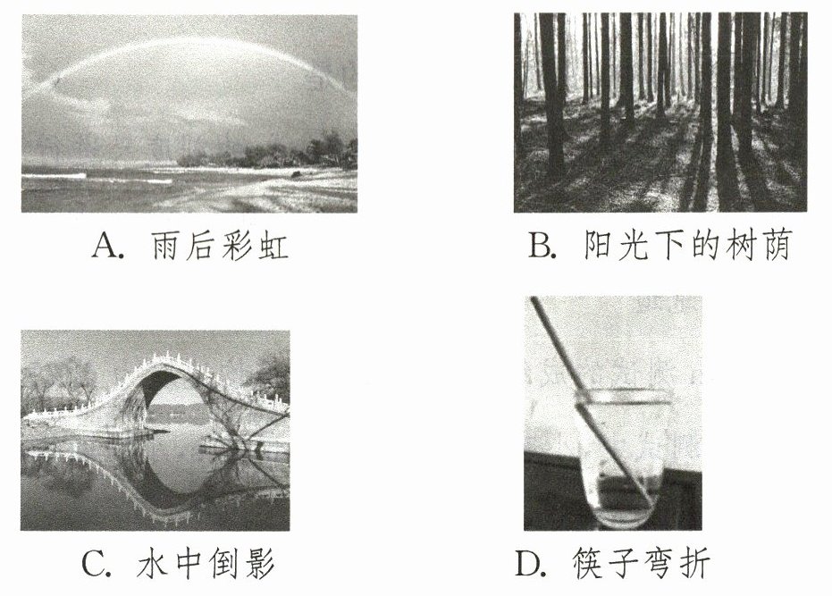 A选项:“雨后彩虹”是光的色散现象,是由于光的折射形成的,不符合题意。