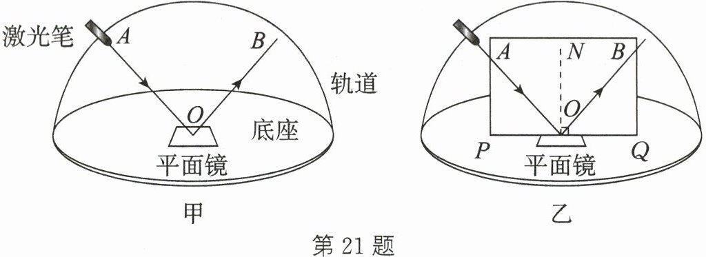 21. (10分)小红用如图甲所示的装置探究“光的反射定律”。平面镜置于水平底座中心。激光笔可沿弧形轨道移动,且保持激光始终射向平面镜上的点O。