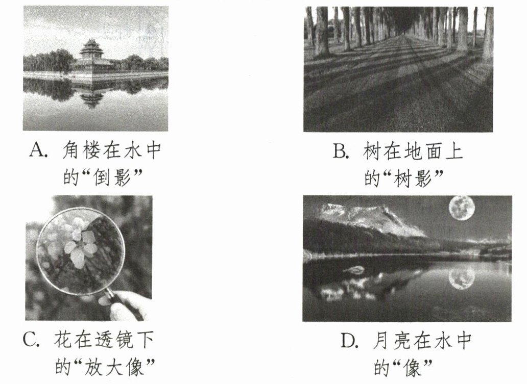 选项D,月亮在水中的“像”是平面镜成像,原理是光的反射,所以D选项不符合题意。
