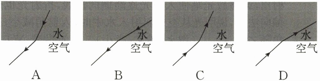 选项D:此选项光路图中,光线从空气斜射入水中,不符合题意,所以D选项错误。