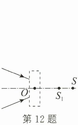 12. 如图所示,一束光线射向点 O 处的光学元件后会聚于主光轴上的点 S 处,去掉光学元件后会聚于点$ S_1,$则该光学元件一定是(