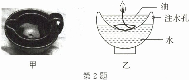 2. 图甲为我国古代的“节能灯”——“省油灯”,图乙为其部分剖面示意图。向灯盏夹层内注水,有助于减慢油的蒸发,达到省油的目的。关于“省油灯”减慢油蒸发的方法,下列说法正确的是 (