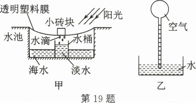 19. 假如你身处偏远海岛,缺乏生存所需的淡水,怎么办?小明为你提供了一种简便的海水淡化方法。在地面上挖一水池,往池内灌海水,按图甲所示完成设备的安装,即可收集淡水。