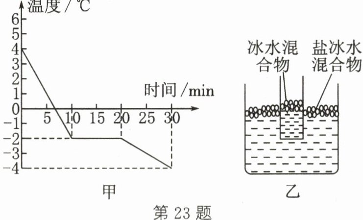 23. (10分)小明猜想,水中加入别的物质后,可能会对水的凝固点产生影响。为了验证这一猜想,他将一些盐放入水中,并把盐水用容器盛好放入冰箱,研究盐水的凝固过程。每隔一定时间,小明就观察盐水的状态、测出温度,并利用凝固过程记录的温度数据与对应时间,作出了凝固图像,如图甲所示。