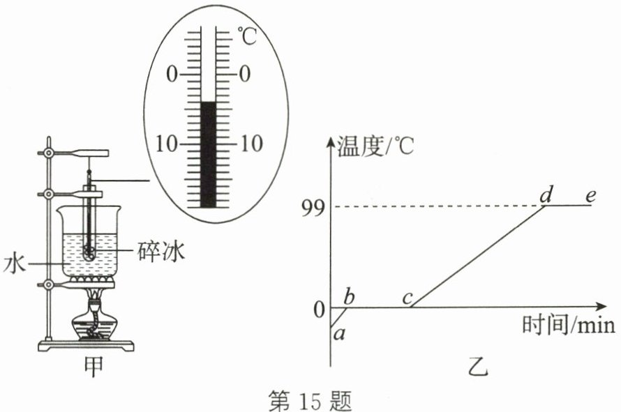 15. 如图甲所示,试管中装有适量碎冰,用酒精灯对烧杯中足量的水进行加热,用温度计测量不同时刻的温度值,温度随时间变化的图像如图乙所示。