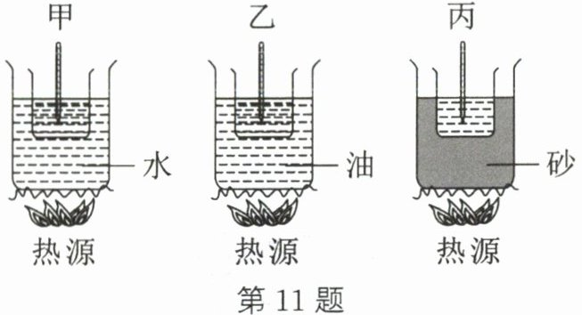 11. 某兴趣小组以相同的烧杯盛等量的水,以相同的热源同时加热,如图所示,甲杯为隔水加热,乙杯为隔油加热,丙杯为隔砂加热。加热一段时间后,测得烧杯外物质的温度分别为水温100℃、油温300℃、砂温600℃,且观察到乙、丙两烧杯中的水呈沸腾状态,则三杯水的温度高低顺序为 (