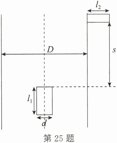 25. (9分)马路宽D= 3 m,一辆长$l_1= 4.5 m,$宽d= 1.8 m的汽车以$v_1= 36 km/h$的速度在路中间匀速向前行驶,此时距车头s= 10.5 m处有一辆长$l_2= 1.8 m$的自行车横穿马路,如图所示。为了自行车安全过马路,它的速度应在什么范围内?(自行车的宽度忽略不计)