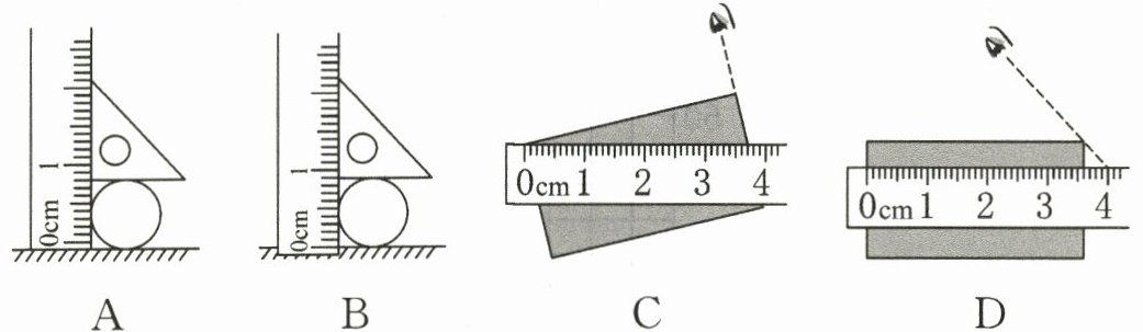 解:测量圆球直径时,需用两块直角三角板将圆球夹在中间,使刻度尺有刻度线的一侧紧贴三角板的直角边,且圆球直径两端与三角板的直角顶点对齐,A选项中三角板放置正确,B选项中三角板未与刻度尺刻度线紧贴,故B错误;测量木块长度时,刻度尺应与被测物体边缘平行,刻度线紧贴木块,读数时视线应与刻度尺刻度线垂直,C选项中刻度尺倾斜,D选项中视线未与刻度线垂直,故C、D错误。因此,正确操作是A。