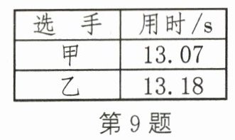 9. 某次田径比赛的冠军争夺在甲、乙两人之间展开。比赛临近结束,选手全力冲刺时,观众齐声欢呼“甲最快”。根据表中所示的比赛成绩,裁判裁定甲获胜,观众和裁判判断甲比乙快的方法分别是 (