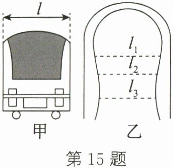 15. 如图甲所示,某列车车厢的宽度$l= 3.500\ m$。为判断该列车车厢能否通过一处老式隧道,技术人员分别测量了隧道内部三处的宽度,如图乙所示,测量结果为$l_{1}= 3.600\ m$、$l_{2}= 3.480\ m$、$l_{3}= 3.540\ m$。技术人员使用的刻度尺的分度值为