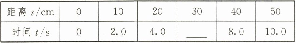 (1)分析表格数据,气泡通过$10cm、20cm、\cdots\cdots$的路程,时间的变化是$2.0s、4.0s、\cdots\cdots$,由此可以判断出漏掉的时间为$6.0s$。