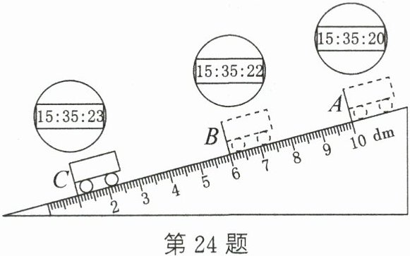 24. (10分)物理实验小组的同学在学习“测量平均速度”时,想测量从斜面上滑下的物体在不同阶段内的平均速度,设计了如图所示的实验装置。让小车从带有刻度(分度值为1 cm)的斜面顶端由静止滑下,图中的圆圈是小车到达A、B、C三个位置时电子表显示的时间(圆圈里面的数分别表示“时、分、秒”),则: