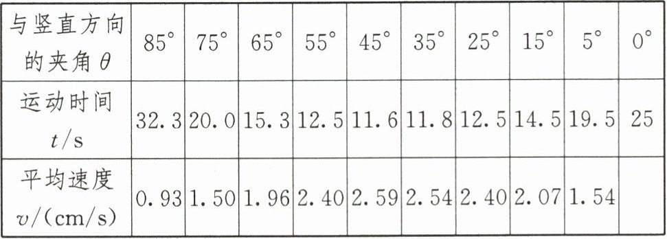 ②从表格中数据可以看出,气泡的运动速度随$\theta$变化的规律是:在$0^{\circ}\sim45^{\circ}$范围内,随着$\theta$的减小速度变大,在$45^{\circ}\sim85^{\circ}$范围内,随着$\theta$的增大速度减小,即气泡的运动速度先随$\theta$的减小而增大,后随$\theta$的减小而减小。