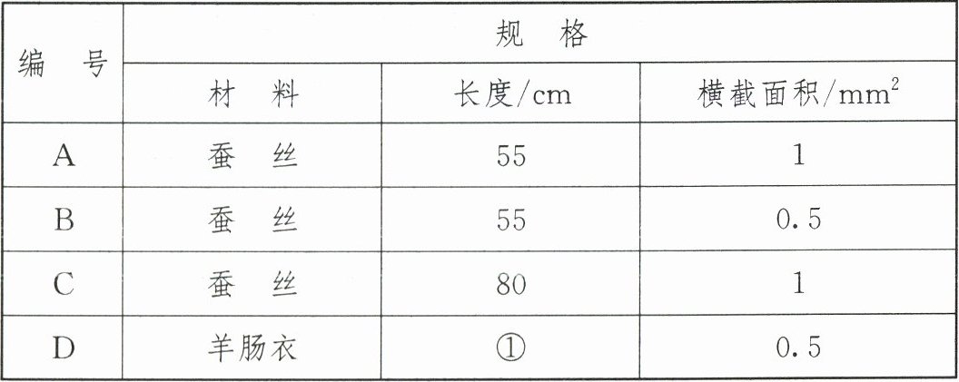 (2)猜想二认为琴弦发出声音的音调高低可能与琴弦的材料有关,为了验证这一猜想,需要控制其他因素(如长度和横截面积)不变,只改变琴弦的材料。观察表格,编号B和D的横截面积都是$0.5mm^2$,但材料不同(B为蚕丝,D为羊肠衣),为了形成对比,D的长度应与B的长度相同,即55cm。所以表中①的位置所缺数据是55。