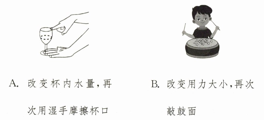 A选项,改变杯内水量,再用湿手摩擦杯口时,杯子和水振动发声,水量不同,振动频率不同,音调不同,所以该选项不符合题意。