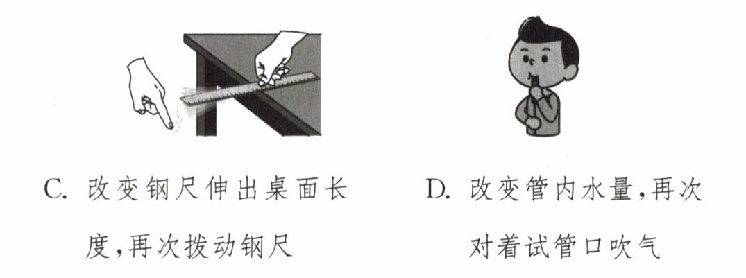 D选项,改变管内水量,再次对着试管口吹气,管内空气柱振动发声,空气柱长度不同,振动频率不同,音调不同,所以该选项不符合题意。
