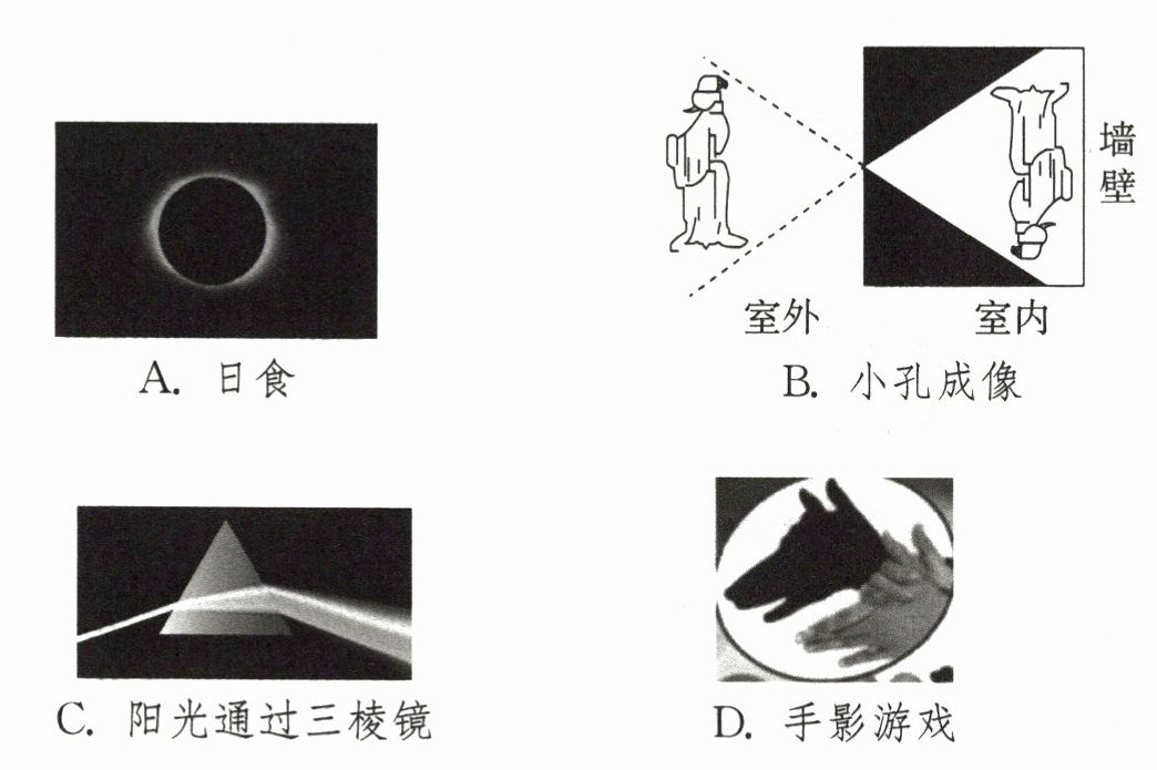 D选项,手影游戏是由于光线被手挡住后,在屏幕上形成的影子,这是光沿直线传播的结果,所以D选项不符合题意。