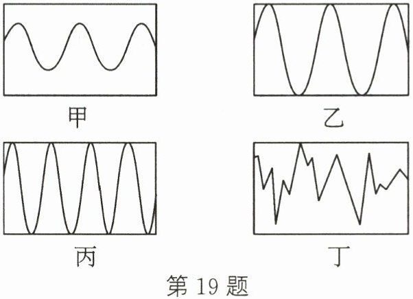 19. 如图所示,某同学用示波器、钢锯条和台钳研究声音的响度。其中音调和图乙相同的是图______,响度和图乙相同的是图______;从图形可知:图______是噪声的波形。