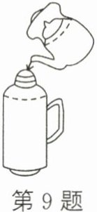 9. 生活中,有人用眼睛看,更有人用耳朵“看”,因为声音向我们传递着很多信息。小明发现,提着水壶向热水瓶中灌开水(如图),开始时,水的落差大,撞击力大,热水瓶里空气多,发出大而低沉的“轰轰”声,水快要满时情况相反,发出小而尖细的“嘟嘟”声。小明判断灌水多少的依据是(