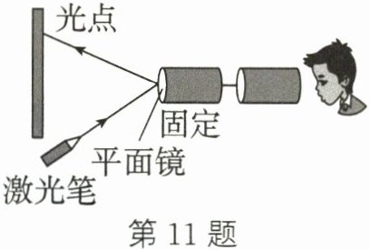 11. 如图所示是小明探究“看”到自己声音的实验,把两个纸杯底部用细棉线连接起来,固定其中一个纸杯,在纸杯口上蒙上胶膜,膜上粘一片小平面镜,拉紧棉线,将激光笔发出的光照射在平面镜上,小明对着另一纸杯说话(不接触纸杯),会看到墙上反射的光点在晃动。下列说法正确的是(