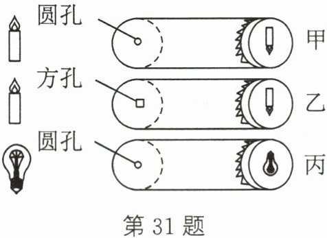 31.(12分)学习了光学知识后,爱动脑筋的桐桐和媛媛想自己探究小孔成像的现象。如图所示,她们给两个空罐的底部中央分别打上一个圆孔和一个方孔,再用两片半透明的塑料膜蒙在空罐的口上,分别将小孔对着烛焰和灯丝,可以看到烛焰和灯丝通过小孔所成的像。